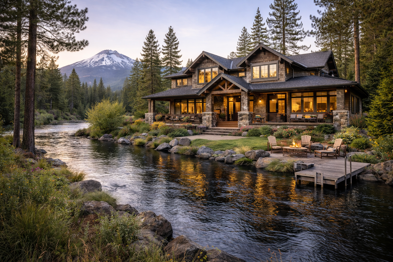 Riverfront craftsman home along the Deschutes River in Bend Oregon showcasing the type of luxury homes common in the Central Oregon real estate market